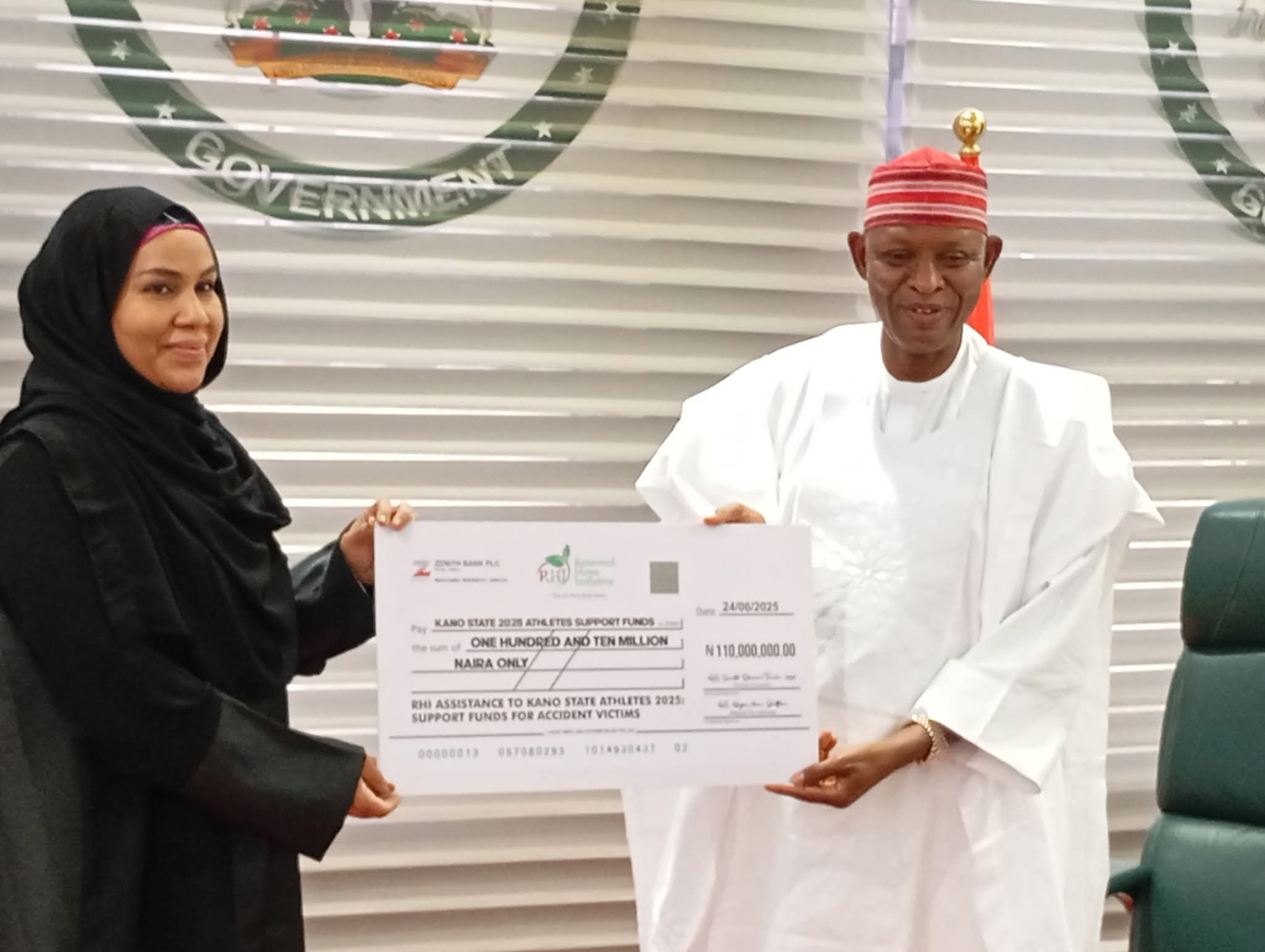 Hajiya Laila Barau Jibrin presented the cheque of the said money to the Kano State Governor, Alhaji Abba Kabir Yusuf.